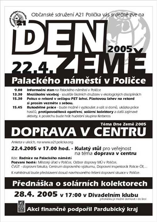 V týdnu 18. - 22.4.2005 pořádáme ve škole v rámci Týdne ekolog. výchovy řadu zajímavých přednášek ( např. Ochrana ovzduší,Příroda východního Polabí,Využití zemního plynu,cestopisné přednášky cestovatele O. Bubáka), projektový den ( 20.4.), brigády na úklid břehů řeky Chrudimky v Pardubicích a Sluneční pláže v plaveckém areálu, sběr papíru , PET láhví a použitých monočlánků, úklid okolí školy, péče o květinovou výzdobu školy.