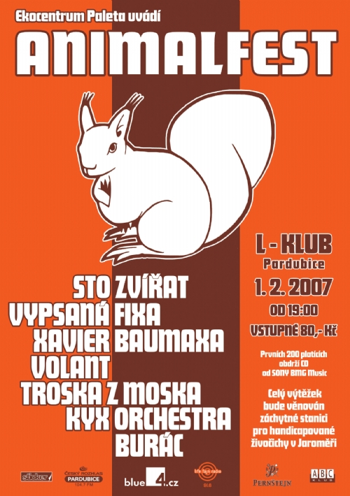 Benefiční festival, jehož celý výtěžek bude věnován Stanici pro handicapované živočichy v Jaroměři. Vystoupí skupiny Sto zvířat, Vypsaná Fixa, Xavier Baumaxa, Volant, Troska z moska, Kyx orchestra a Burác. Vstupné 80 Kč.