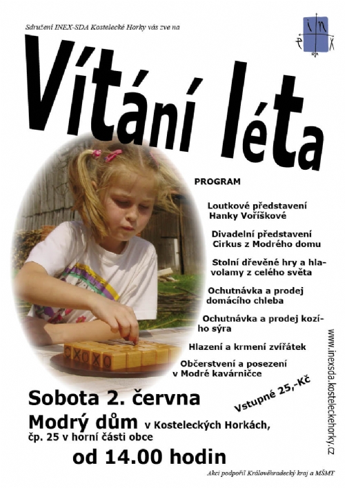 Program: -Loutková pohádka pro malé i velké loutkářky Hanky Voříškové. -Dramatická improvizace příběhu o návštěvnících z Vesmíru a hledání přátelství Zuzany Čadové. -Hry na dvoře pro děti Stolní dřevěné hry a hlavolamy pro chytré hlavy - Ochutnávka a prodej domácího chleba a kozího sýra -Prodej čerstvě stáčeného medu z Kosteleckých Horek -Krmení a hlazení zvířátek - možno donést tvrdý chléb a pečivo pro kozy a kůzlata, ovečky a králíky -Posezení v Modré kavárničce Vstupné 25,-Kč Pořádá INEX - SDA Kostelecké Horky Akci podpořilo Ministerstvo školství, mládeže a tělovýchovy a Královéhradecký kraj