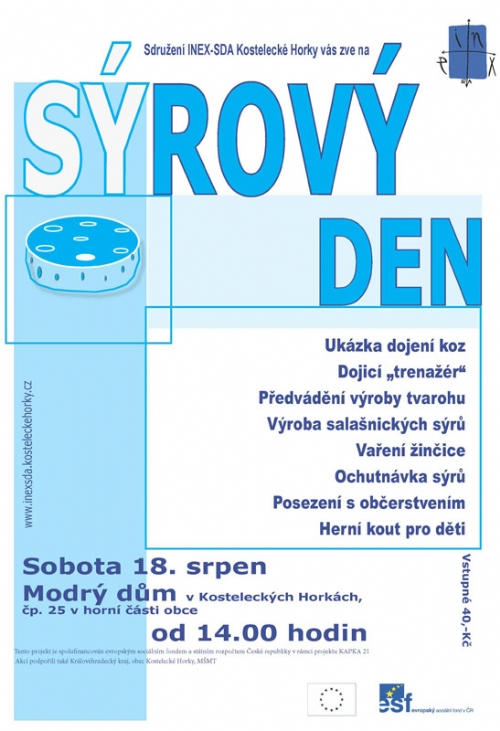 druhý ročník sýrového a sýrařského odpoledne v Kosteleckých Horkách. 18. srpen 2007 od 14.00 hodin Modrý dům čp. 25 v horní části Kosteleckých Horek Ukázka dojení Dojicí trenažér Předvádění výroby tvarohu a různých druhů sýra Výroba salašmických sýrů Vaření žinčice Ochutnávka Posezení Herní kout pro děti Vstupné 40,-Kč Kudy do Horek zjistíte na www.inexsda.kosteleckehorky.cz