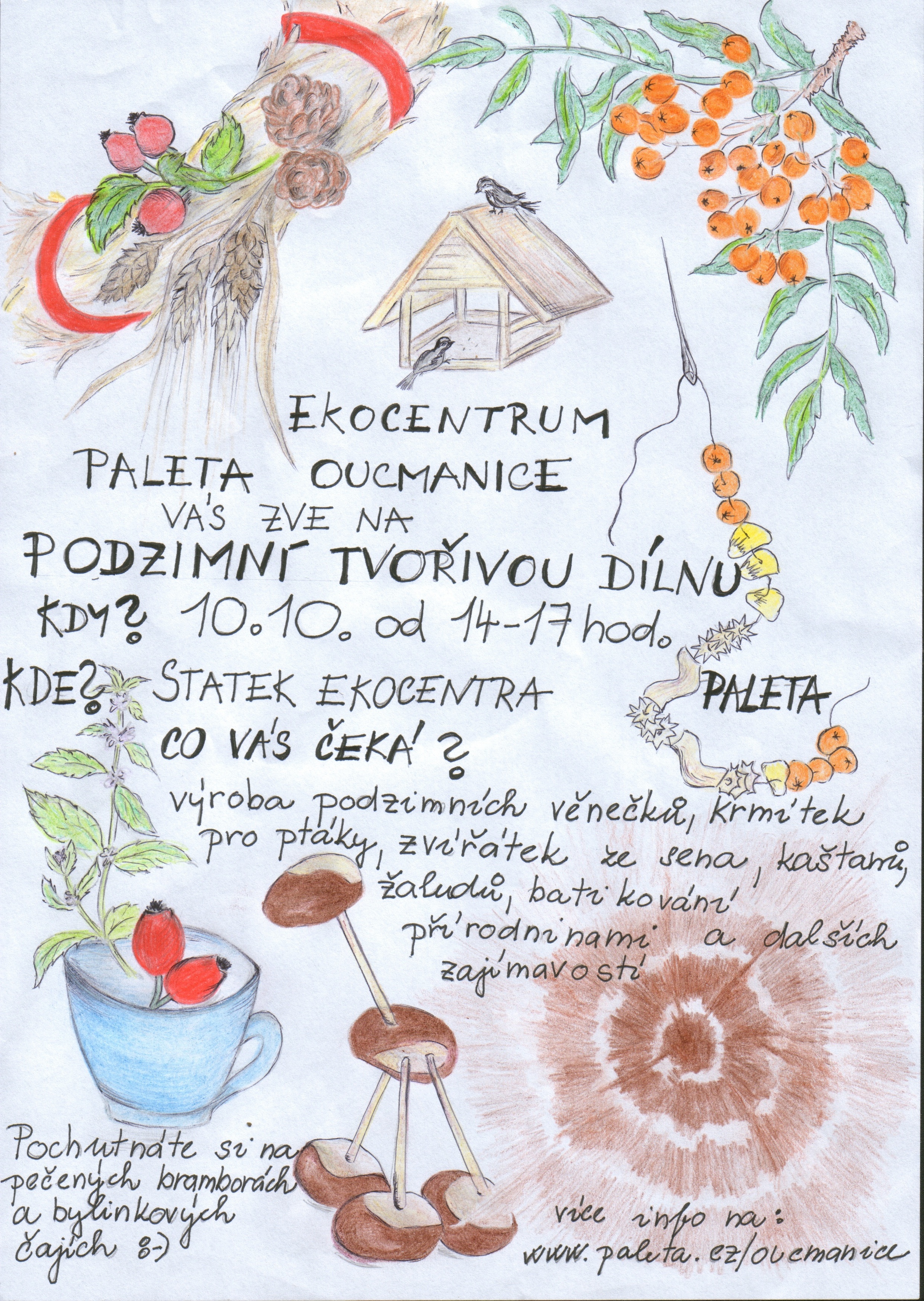 Přijd´te nasát podzimní atmosféru:-)Co Vás čeká a nemine?Vyrobíte si podzimní věnečky, ptačí budku, zvířátka ze sena, kaštanů, zkusíte batiku přírodními materiály a spoustu dalšího.Těšíme se na Vás.