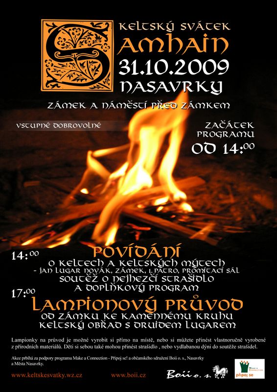 Oslava keltského svátku Samhain je připravena pro děti a rodiče v předvečer Dušiček - v sobotu 31. října. Společně si budou moci sami ručně vyrobit lampionky, strašidla z přírodních materiálů a poznat něco z historie Keltů a keltských řemesel . Akce je doplněna hrami a soutěžemi, nebude chybět ani soutěž o nejhezčí strašidlo a na závěr se děti mohou těšit na lampionový průvod . Začátek svátku je ve 14 hodin před zámkem , lampionový průvod vyrazí ke kamennému kruhu v 17 hodin, předpokládaný závěr je v 19 hodin. Více také na stránkách www.keltskesvatky.wz.cz a www.boii.cz