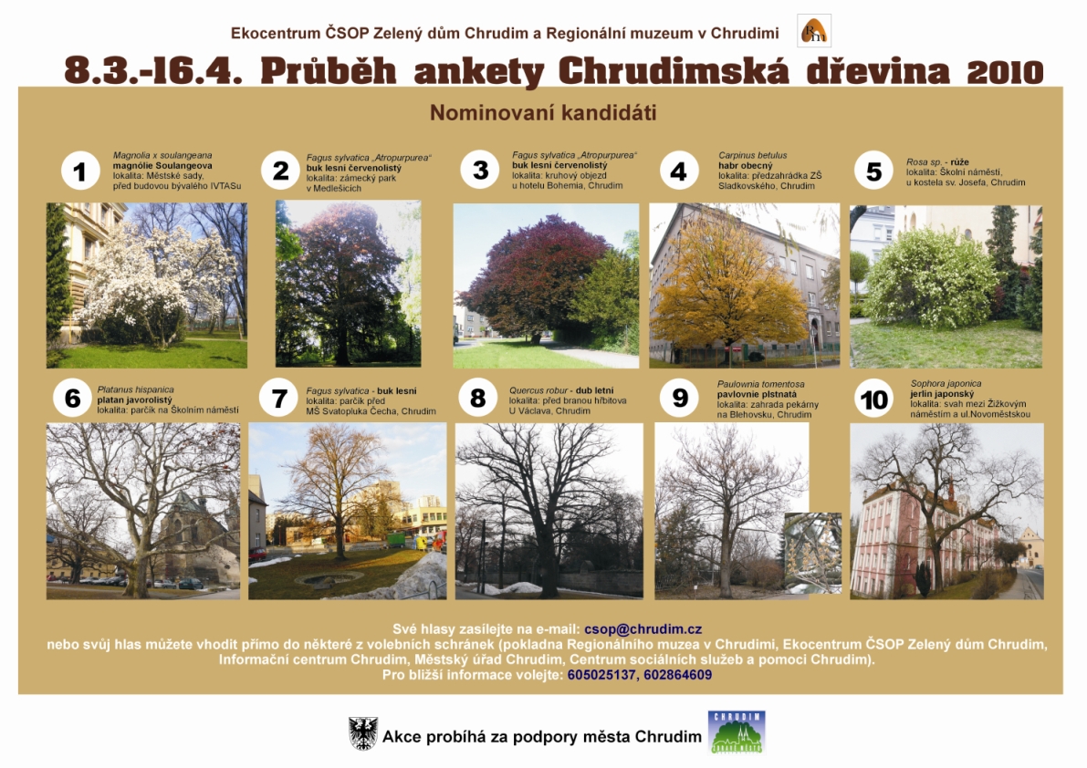 Na základě došlých příspěvků byli nominováni na Chrudimskou dřevinu roku 2010 tito kandidáti: 1. Magnolia x soulangeana - magnólie Soulangeova lokalita: Městské sady, před bývalou budovou IVTASu 2. Fagus sylvatica „Atropurpurea“ - buk lesní červenolistý lokalita: zámecký park v Medlešicích 3. Fagus sylvatica „Atropurpurea“ - buk lesní červenolistý lokalita: kruhový objezd u hotelu Bohemia, Chrudim 4. Carpinus betulus - habr obecný lokalita: předzahrádka ZŠ Sladkovského, Chrudim 5. Rosa sp. – růže lokalita: Školní náměstí, u kostela sv. Josefa, Chrudim 6. Platanus hispanica - platan javorolistý lokalita: parčík na Školním náměstí 7. Fagus sylvatica - buk lesní lokalita: parčík před MŠ Svatopluka Čecha, Chrudim 8. Quercus robur - dub letní lokalita: před vchodem hřbitova U Václava 9. Paulownia tomentosa - pavlovnie plstnatá lokalita: zahrada pekárny na Blehovsku, Chrudim 10. Sophora japonica - jerlín japonský lokalita: svah mezi Žižkovým náměstím a ul.Novoměstskou Své hlasy zasílejte na email: csop@chrudim.cz Tato emailová adresa je chráněna před spamboty, abyste ji viděli, povolte JavaScript nebo svůj hlas můžete vhodit přímo do některé z volebních schránek (pokladna Regionálního muzea v Chrudimi, Ekocentrum ČSOP Zelený dům Chrudim, Informační centrum Chrudim, Městský úřad Chrudim, Centrum sociálních služeb a pomoci Chrudim.) Chtěli bychom touto cestou poděkovat všem dosavadním přispěvatelům. A doufáme v hojnou účast při pokračování této akce. Pro bližší informace volejte: 605 025 137, 602 864 609