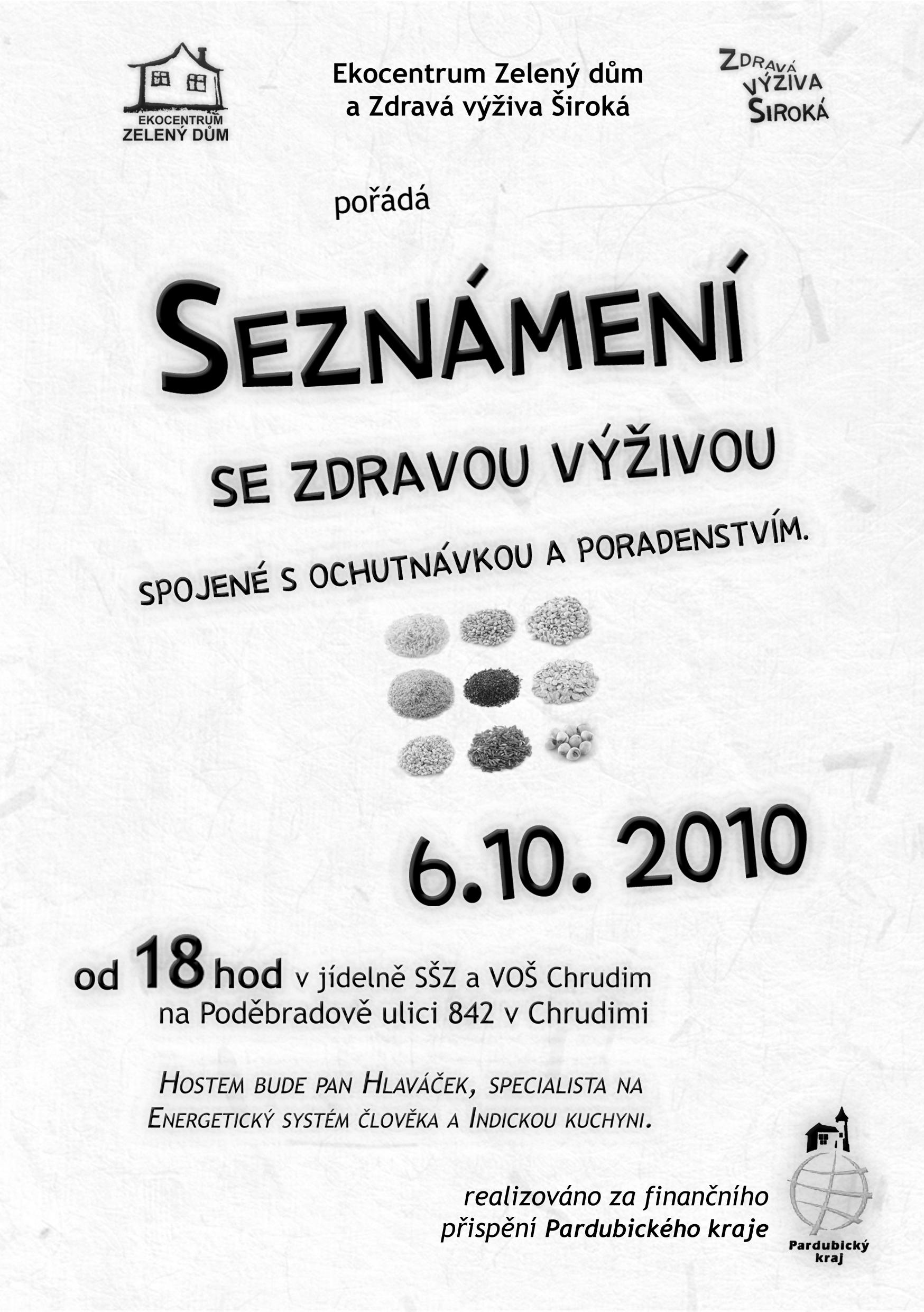 Ekocentrum Zelený dům a Zdravá výživa Široká, pořádá v jídelně SŠZ a VOŠ Chrudim na Poděbradově ulici č.p 842 v Chrudimi ( od Pardubic směr Stromovka a OSSZ http://www.szes.chrudim.cz/ ),, Seznámení se zdravou výživou" spojené s OCHUTNÁVKOU a PORADENSTVÍM. Hostem bude pan Hlaváček, specialista na energetický systém člověka a INDICKOU kuchyni. Akce probíhá v rámci Dnů zdraví, podpořeno Pardubickým krajem.
