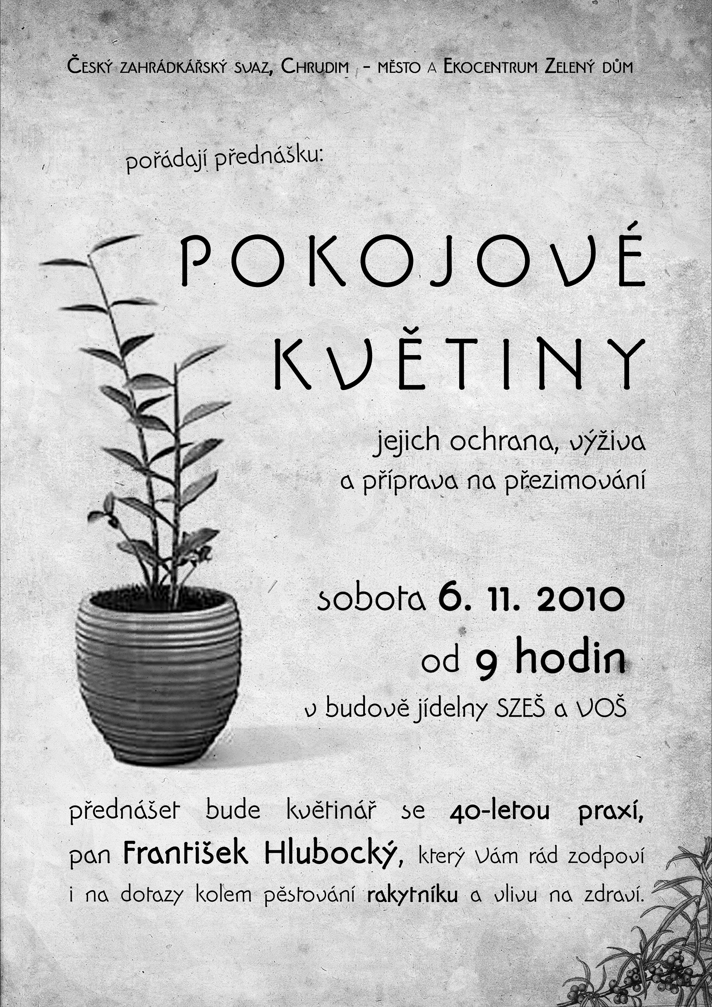 Přednáší pan František Hlubocký. Hlavním tématem budou pokojové květiny, jejich ochrana , výživa, příprava na přezimování. Zodpoví dotazy i kolem pěstování rakytníku a vlivu na zdraví.