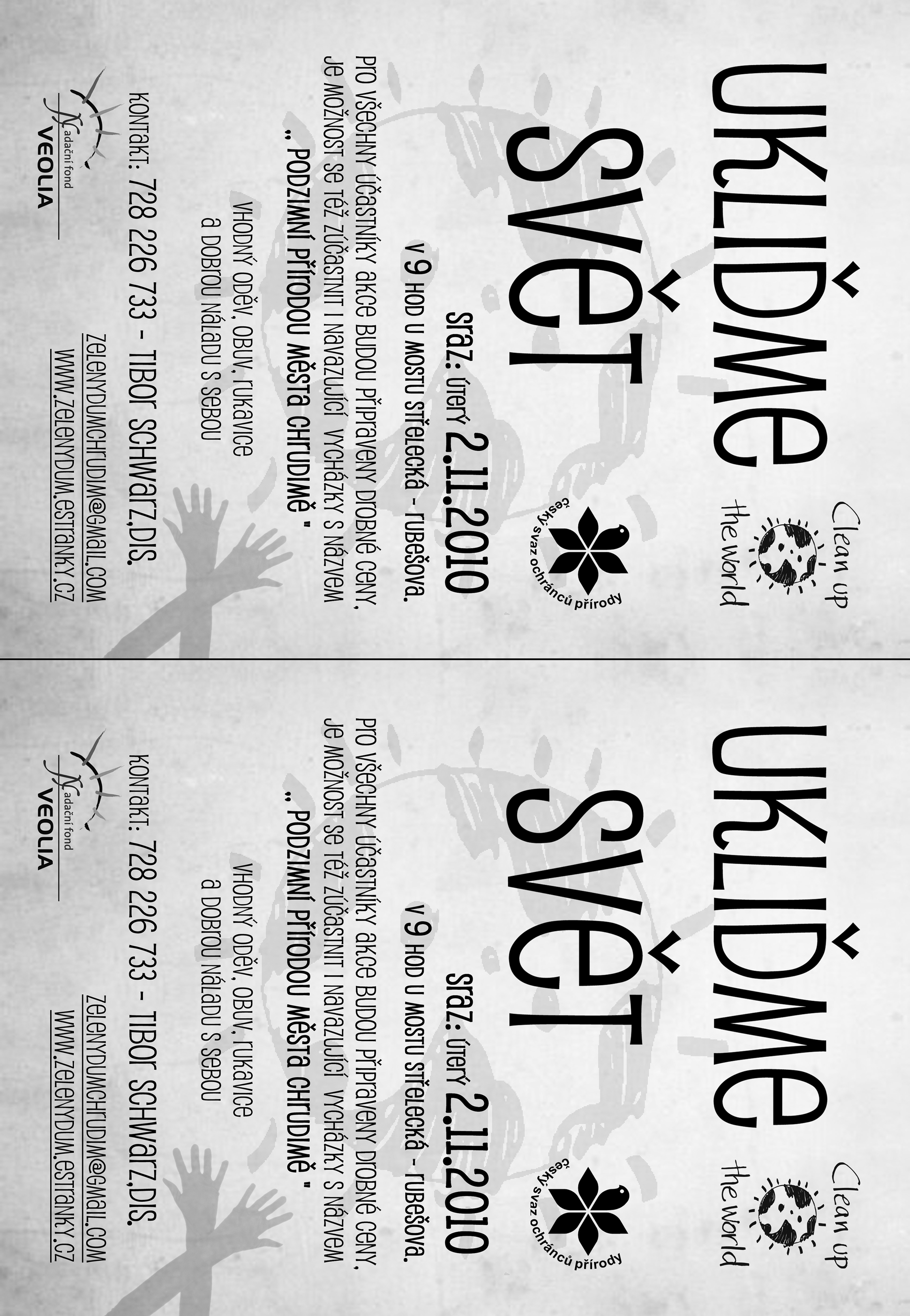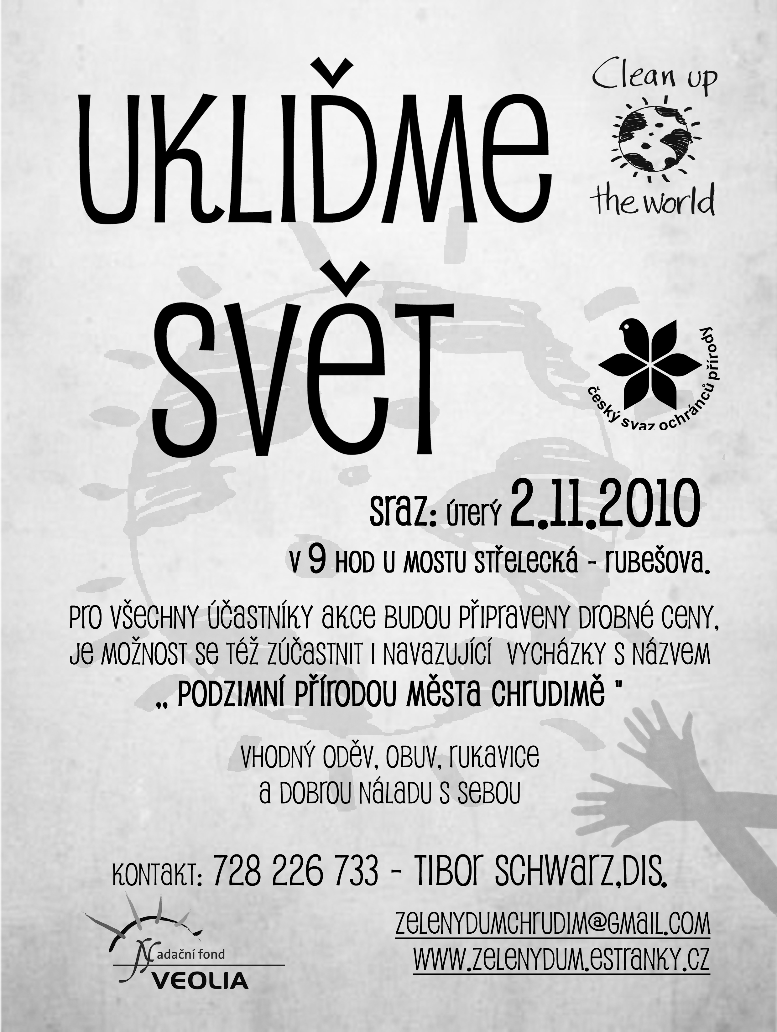 Akce ,,UKLIĎME SVĚT" se uskuteční dne 2.11.2010, sraz v 9 hod u mostu Střelecká - Rubešova, s sebou pracovní oblečení, pití. Po té se uskuteční vycházka s názvem ,,ZA PODZIMNÍ PŘÍRODOU CHRUDIMĚ" , vedenou Tiborem Schwarzem z Ekocentra Zelený dům.