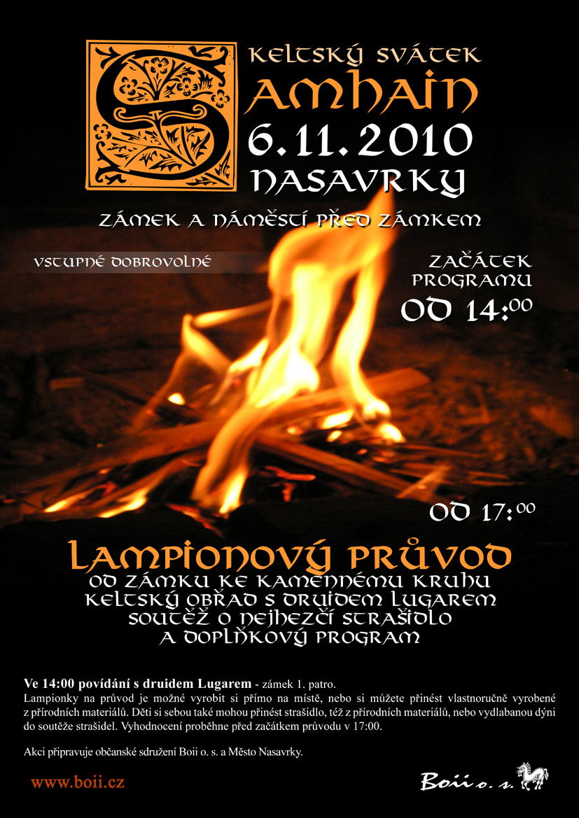 Děti si mohou vyrobit strašidlo do soutěže anebo lampióne, od 14:00 hodin proběhne „Povídání s druidem Lugarem“ v 1. patře zámku, v 17:00 hodin vyhodnocení soutěže strašidel a lampiónový průvod. Akci zakončíme po 17. hodině druidským novoročním obřadem u kamenného kruhu u Nasavrk. Na oslavách nebude chybět ani tradiční nápoj Keltů – teplá medovina nebo čaj na zahřátí a drobné sladké občerstvení. Příjemnou podzimní atmosféru pak doplní keltská hudba. Přijďte s námi oslavit keltský Nový rok! Více informací na www.boii.cz