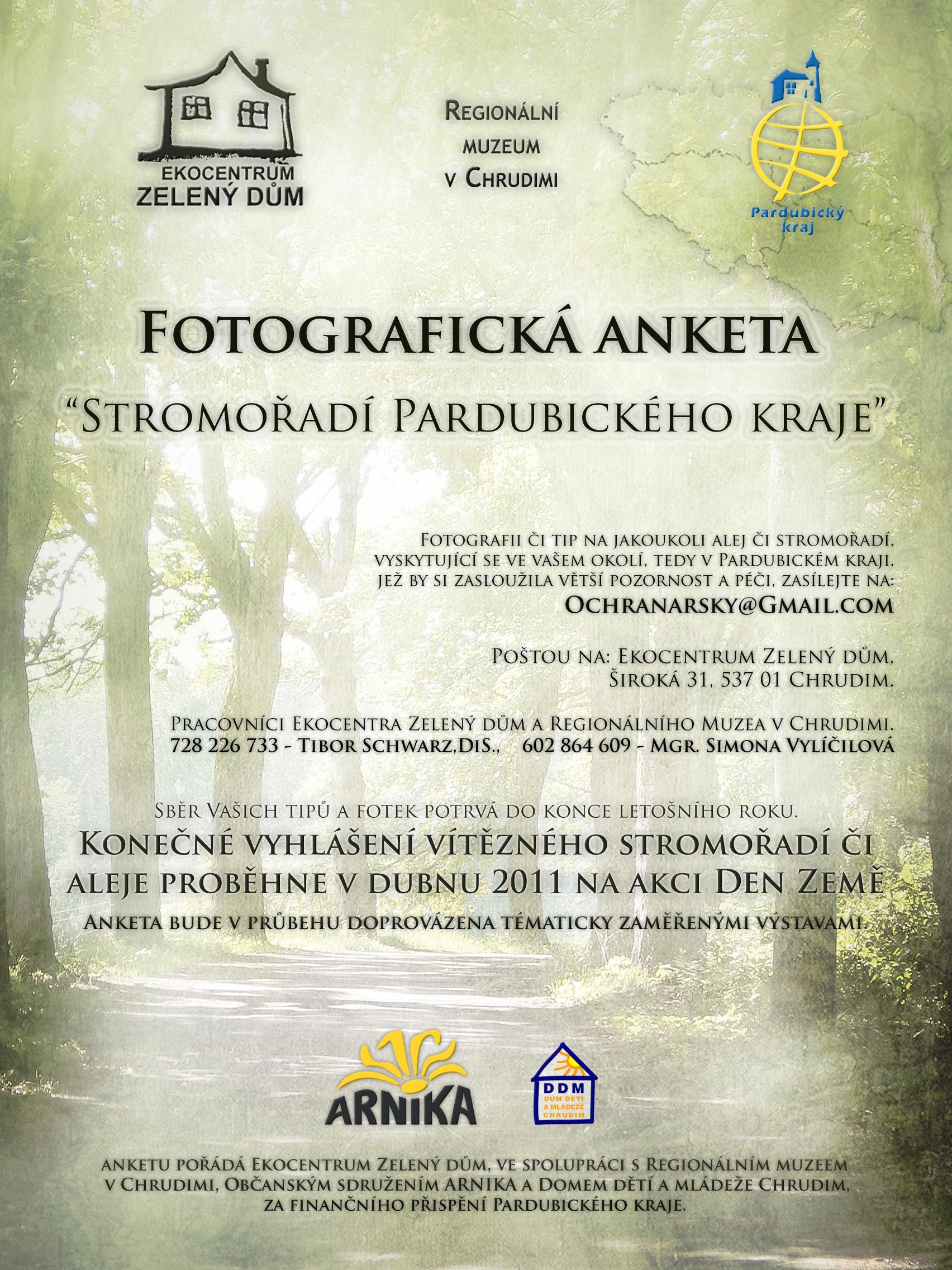 V závěru letošního léta jsme pro Vás připravili novou, tentokrát fotografickou, anketu pod názvem Stromořadí Pardubického kraje. CÍLEM ankety je popularizovat aleje a stromořadí mezi veřejností jako přírodně kulturní a vlastivědnou hodnotu. Veřejnost bychom rádi pobídli k větší všímavosti při pobytu ve svém okolí a k společnému úsilí o zachování tohoto krajinného prvku, jež je neodlučitelně spjat s komunikací, cestou či pěšinou. Budeme velmi vděční za každou fotografii či tip na jakoukoli alej či stromořadí, jež by si jistě zasloužilo větší péči a pozornost. Ve spolupráci s OBČANSKÝM SDRUŽENÍM ARNIKA bude v měsíci ŘÍJNU 2010 a v DUBNU 2011 na toto téma pořádána na DOMU DĚTÍ A MLÁDEŽE V CHRUDIMI na Palackého ulici i výstava. Druhou výstavu O ALEJÍCH budete moci shlédnout i v Městské knihovně ve VYSOKÉM MÝTĚ na Litomyšlské ulici. SBĚR Vašich tipů a fotek potrvá DO KONCE LETOŠNÍHO ROKU. VYHLÁŠENÍ vítězné aleje či stromořadí, jež bude VEŘEJNOST OD ÚNORA 2011 VYBÍRAT, proběhne k mezinárodnímu svátku životního prostředí, na DNY ZEMĚ 2011. Co nás k tomu vedlo? Právě negativní kampaň v našich masmediích ze strany údržbářů vozovek a dalších. Jako příklad bychom rádi uvedli nahnutý osud aleje ve Vysokém Mýtě, kterou se naštěstí díky zájmu veřejnosti podařilo zachránit. Své tipy a fotografie posílejte na EMAILOVOU ADRESU: OCHRANARSKY@GMAIL.COM Poštou na : EKOCENTRUM ZELENÝ DŮM, ŠIROKÁ 31, 537 01 CHRUDIM Mobil: 728 226 733 – Tibor Schwarz,DiS., 602 864 609 – Mgr. Simona Vylíčilová Pracovníci Ekocentra Zelený dům a Regionálního Muzea v Chrudimi. Finančně podpořeno Pardubickým krajem.