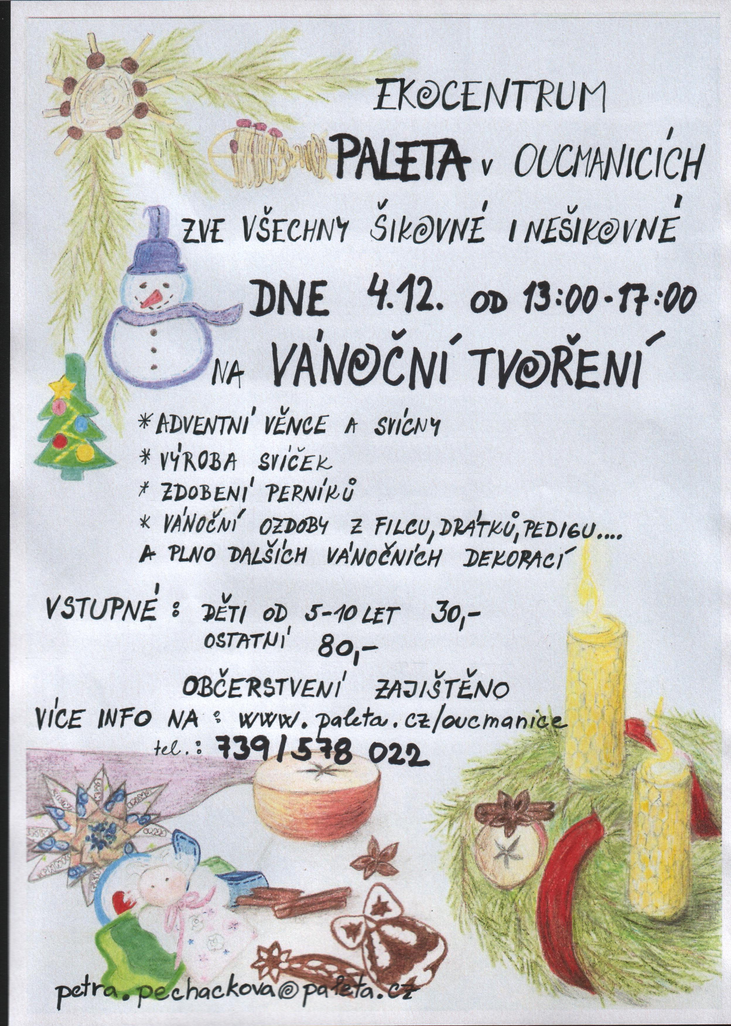 Neděle 12.12. MEDOVÉ CHALOUPKY Od 14,00.- Oblíbená předvánoční rukodělná dílna při které si slepíte a polevou ozdobíte perníkovou scenerii s chaloupkou . Účastníci si přinesou pevnou podložku (prkénko), na kterém si chaloupku odnesou. Medovné 40Kč. Zájemci o dílnu se nahlásí do 30.11. na tel 603990965 Věře Malátkové