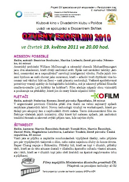 Budou se promítat 3 zajímavé filmy: MISSION POSSIBLE, PLETAČI a ŠITKREDIT. Více informací o filmech v příloze.