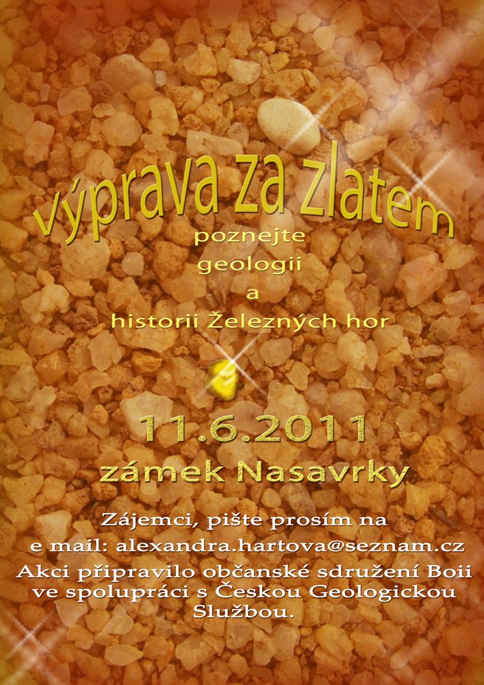 Kdož se chcete na chvíli stát zlatokopem vězte, že výprava za zlatem se koná v sobotu 11. června od 9:00 hodin! Kdo máte zájem prosím napište na e-mail: alexandra.hartova@seznam.cz