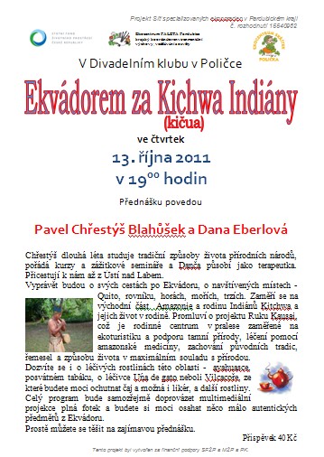 Zajímavá přednáška o putování po Ekvádoru doplněná multimediální projekcí. Více informací naleznete v příloze.