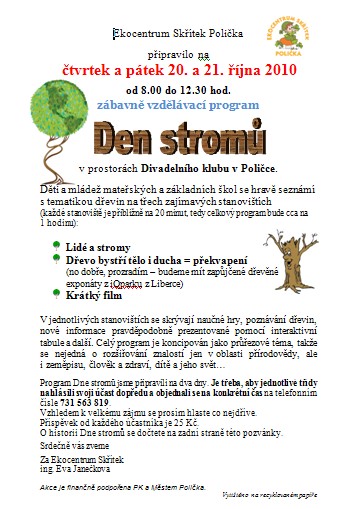 Ve čtvrtek a pátek 20. a 21. října 2010 od 8.00 do 12.30 hod. proběhne zábavně vzdělávací program Den stromů v prostorách Divadelního klubu v Poličce. Děti a mládež MŠ a ZŠ se hravě seznámí s tematikou dřevin na třech zajímavých stanovištích (každé stanoviště je přibližně na 20 minut, tedy celkový program bude cca na 1 hodinu). Více informací v příloze.