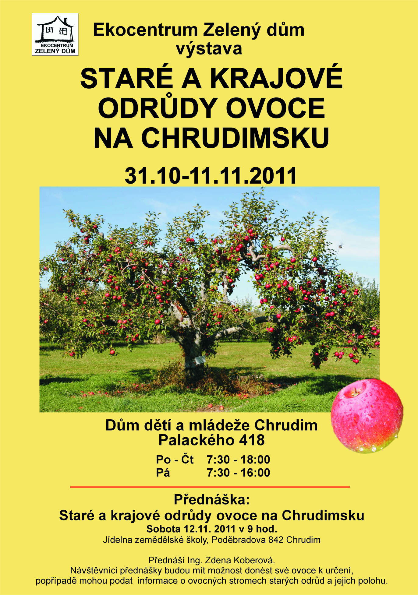 bude probíhat v areálu Střední školy zemědělské a VOŠ Chrudim na ulici Poděbradova 842. Tel: 469 620 363. Bude zde představena činnost Českého svazu zahrádkářů Chrudim, Ekocentra Zelený dům a dalších organizací. Pátek - 7.10.2011: od 9hod do 17hod. Sobota - 8.10.2011: od 8hod do 15 hod. Email: zelenydumchrudim@gmail.com