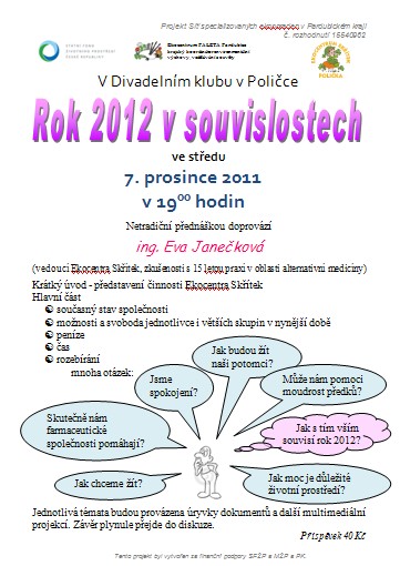 Na úvod představíme činnost ekocentra a v hlavní části budeme rozebírat současný stav společnosti, možnosti a svobodu jednotlivce i větších skupin, peníze, čas, životní prostředí a další témata. A samozřejmě jak s tím vším souvisí rok 2012. Více v pozvánce.