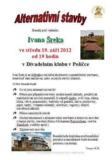 Beseda s Ivanem Šrekem, který má praktické zkušenosti ze staveb, které sám realizoval nebo se staveb účastnil - např. stavba Zemělodi. Více v příloze.