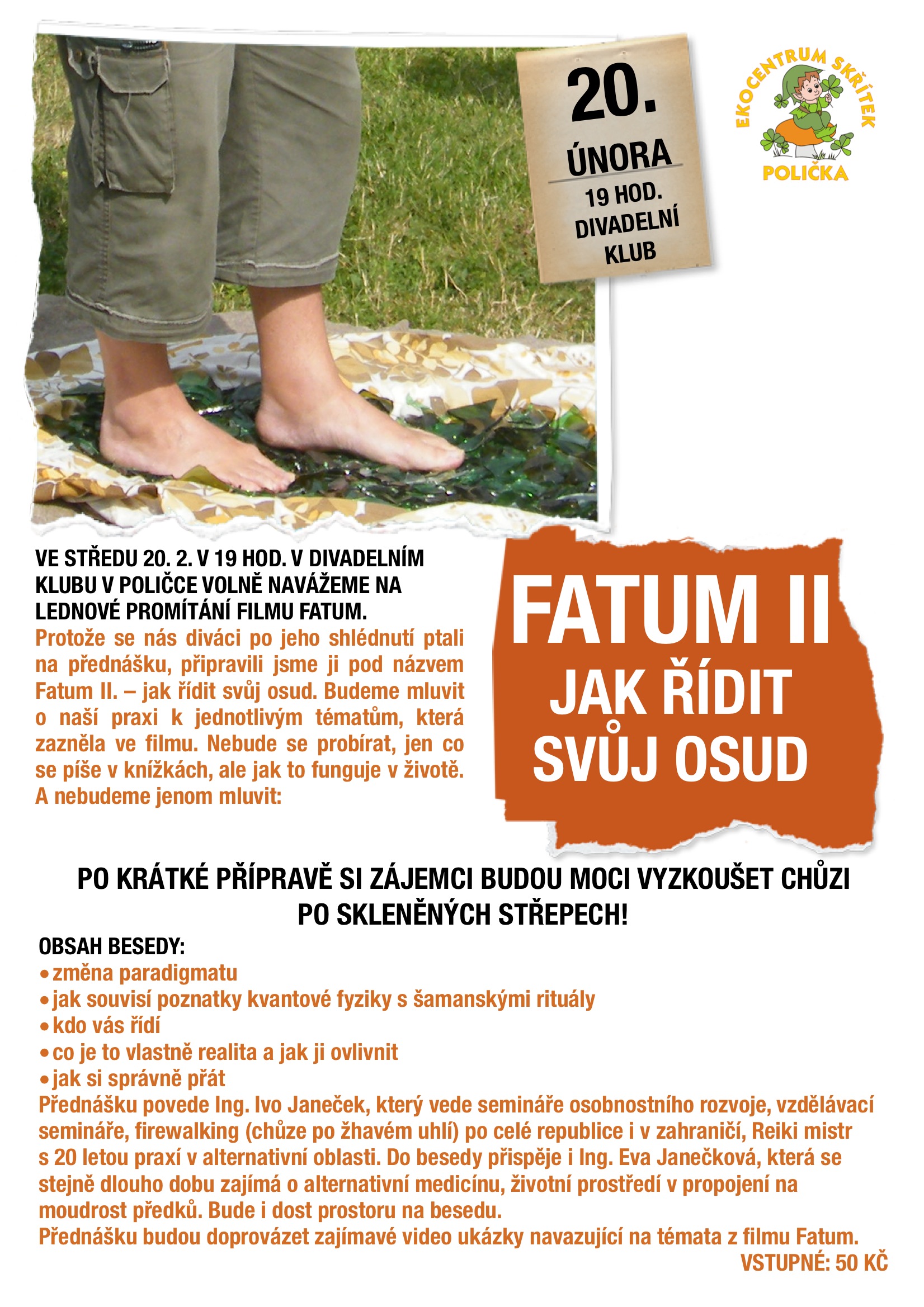 Volně navážeme na lednové promítání filmu Fatum. Protože se nás diváci po jeho zhlédnutí ptali na přednášku, připravili jsme ji pod názvem Fatum II. – jak řídit svůj osud. Více v pozvánce v příloze.