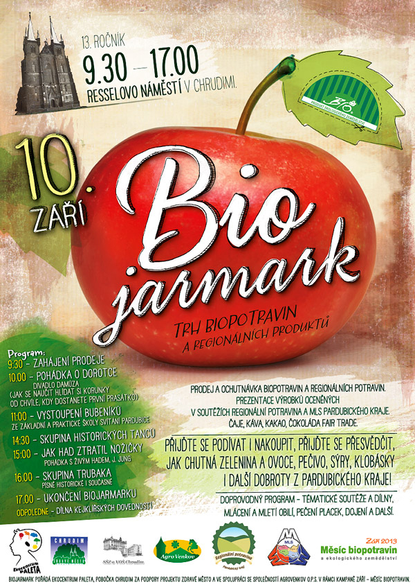 V letošním roce se představí jak potraviny pěstované bez použití chemických hnojiv, postřiků a GMO, tak i další zajímavé regionální potraviny, v prvé řadě ty, které byly oceněny v soutěžích Regionální potravina a Mls Pardubického kraje. Nabídku regionálních produktů doplní čaj, káva, kakao a čokoláda férového obchodu Fair Trade. Po celý den bude připraven i zajímavý doprovodný program - divadelní a hudební vystoupení, moderované vstupy s prodejci a odborníky, tematické soutěže a dílny, ukázky mlácení a mletí obilí, pečení placek, dojení na trenažéru a další . Program: 9:30 zahájení prodeje 10.00 Pohádka o Dorotce, divadlo Damúza (jak se naučit hlídat si korunky od chvíle, kdy dostanete první prasátko) 11:00 vystoupení bubeníků ze Základní a Praktické školy Svítání Pardubice 14:30 skupina historických tanců Trubadanc 15:00 Jak had ztratil nožičky, pohádka s živým hadem, J. Jung 16.00 skupina Trubaka, písně historické i současné 17.00 ukončení biojarmarku Přijďte se podívat i nakoupit, přijďte se přesvědčit, jak chutná zelenina a ovoce, pečivo, sýry, klobásky i další dobroty z Pardubického kraje!