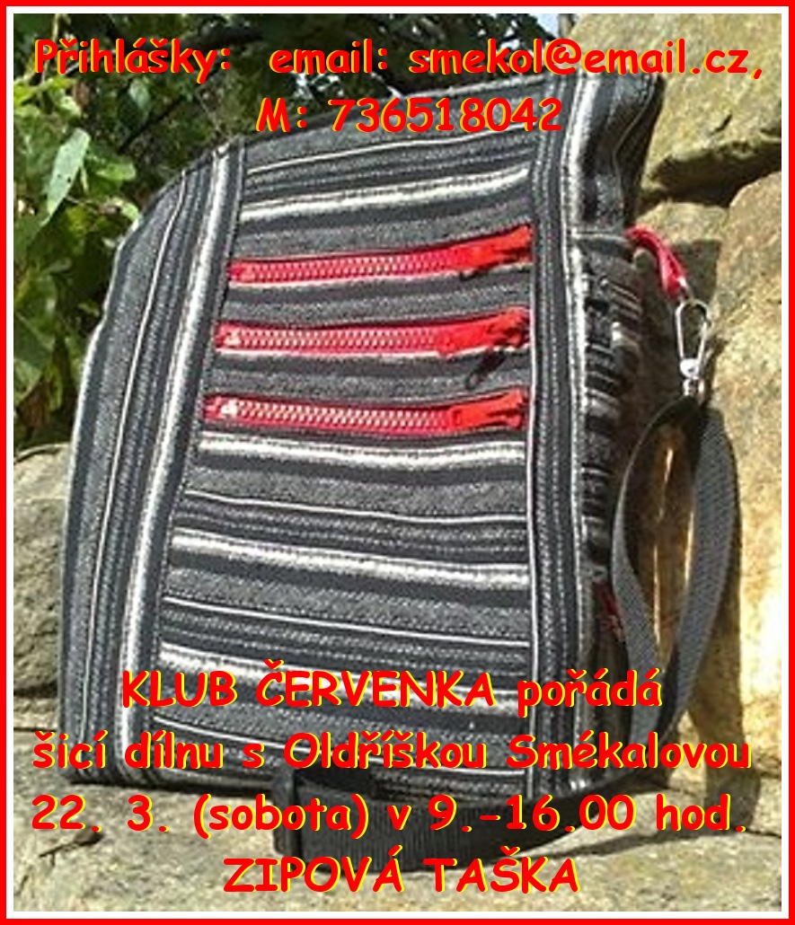 Lektorka: Oldřiška Smékalová Pomůcky na tašku: Na líc: 45cm látky šíře 110cm, zip 40cm, 3 zipy 16-18cm (případně 130cm zipu v metráži a 4 jezdce), 110cm popruh na ucho v šířce cca 3cm, 2 karabiny podle šířky popruhu na připínání a průvlečná spona, popruh 1,5 – 2cm asi půl metru, 4 kusy kroužků s průměrem cca 2-2,5cm, kousek (2cm) suchého zipu na zapnutí boční kapsičky na mobil Do rubu: jednostranně lepící výztuž (ronar – fix, ronofix), podšívkovina 45cm v šíři 110cm, karabinka na poutko, 20cm v šíři 110 cm kapsoviny, Šicí stroj (v malé míře k zapůjčení), nitě v barvě materiálu, jehly podle síly, zipovou patku. Lektorné: 100,- Kč členky Klubu Červenka a 150,- Kč ostatní účastníci Přihlášky: email: smekol@email.cz, M: 736518042 http://www.ctrebova.cz/klub-cervenka ŠICÍ DÍLNY – ZE STARÉHO NOVÉ Finančně podpořeno Pardubickým krajem