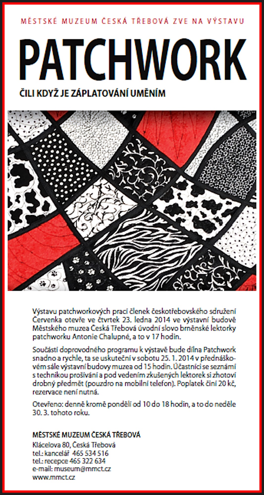 Výstavu prací členek českotřebovského sdružení Klubu Červenka otevře ve čtvrtek 23.1.2014 úvodní slovo brněnské lektorky pachworku Antonie Chalupné v 17.00 hod. Součástí výstavy, která potrvá do 30.3. 2014 je dílna v sobotu 25.1. v 15.00 hod. Za poplatek 20,- Kč si účastníci ušijí pouzdro na mobil.