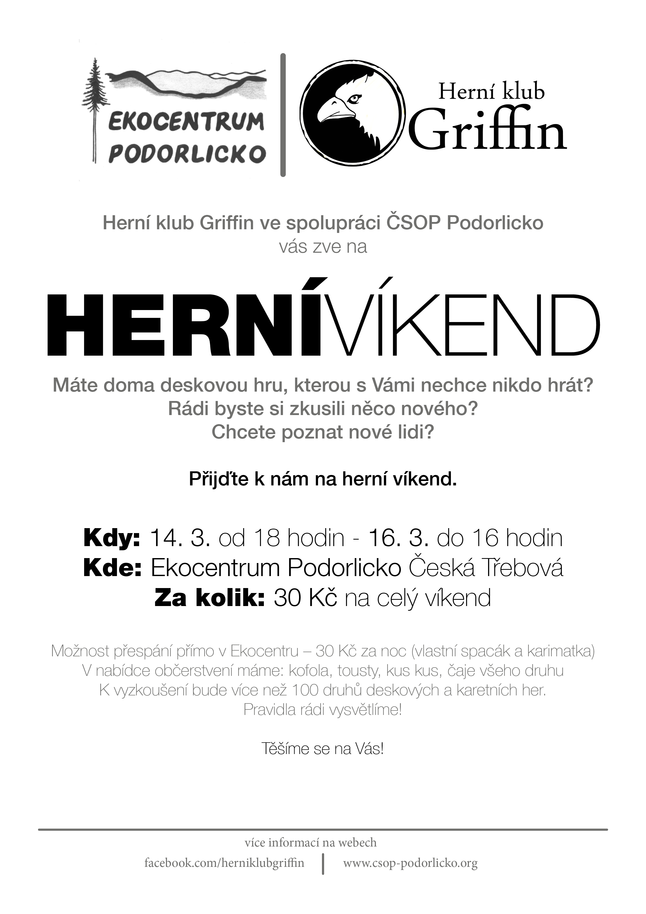Máte doma deskovou hru, kterou s Vámi nechce nikdo hrát? Rádi byste si zkusili zahrát novou deskovou hru? Chcete poznat nové lidi stejných zájmů? Přijďte na herní víkend! K vyzkoušení bude asi 100 druhů deskových a karetních her. Pravidla organizátoři rádi vysvětlí. Můžete se zúčastnit části víkendu nebo zde strávit celý víkend. Možnost přespání přímo v ekocentru ve vlastním spacáku a na vlastní karimatce (30Kč za noc). V nabídce občerstvení budou čaje, kofola, tousty, kuskus. Účastnický poplatek 30 Kč Organizuje ZO ČSOP Podorlicko a Herní klub Griffin
