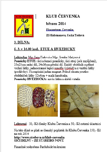 Lektorka: Mgr.Jana Fialová a Mgr. Irenka Matysová Pomůcky ETUE: šicí a řezací pomůcky, šicí stroj (je k zapůjčení), 25x23cm zadní díl, 24x16cm přední díl. Každý obdélník z pěkné vrchní látky, jednostranné lepící ronofix (výstuž) a z vnitřní látky (podšívky). Na zapínání jeden magnet. Pokud chcete poutko: obdélníček látky 12x4cm + malá karabinka. Pomůcky HVĚZDIČKA: navíc látku a slabší vatelín Lektorné: 30,- Kč členky Klubu Červenka a 50,- Kč ostatní účastníci Finančně podpořeno Pardubickým krajem.