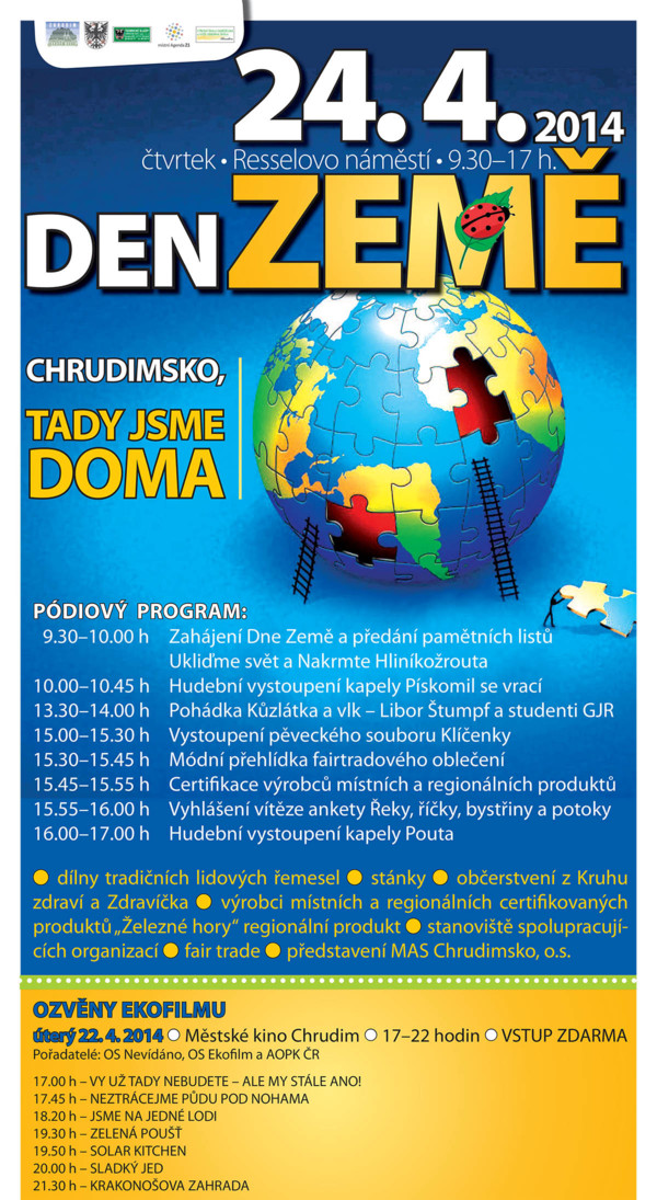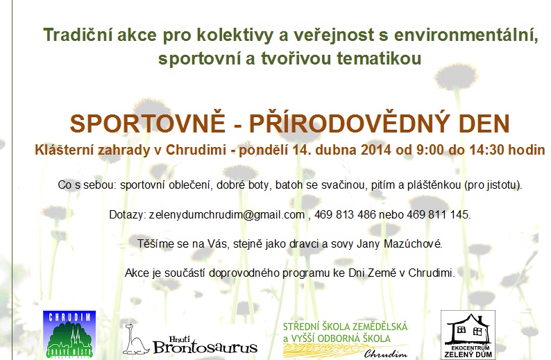 6.ročník tradiční akce, tentokrát mimořádně v Klášterních zahradách. Na environmentálních, tvořivých a sportovních stanovištích se na Vás Těší Dravci a sovy Jany Mazúchové, pracovníci Ekocentra Zelený dům, Klub Hnutí Brontosaurus a studenti SŠZ a VOŠ Chrudim.