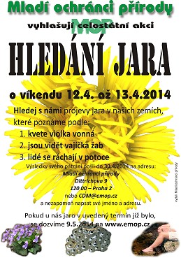Hledání jara Celostátní akce všech příznivců přírody, kteří každý rok druhý víkend v dubnu pátrají po projevech jara v naší republice. Pojďte s námi druhý dubnový víkend 12. – 13.4.2014 opět hledat jaro do tuzemské přírody! Letos jaro poznáme podle těchto projevů: 1. kvetou violky vonné 2. jsou vidět vajíčka žab – pomůcka pro hledače 3. lidé se ráchají v potoce Stáhněte si letáky buď jako obrázek nebo jako tiskový soubor. A nezapomeňte: druhý dubnový víkend společně hledáme jaro! Výsledky vašeho pátrání můžete zasílat poštou, emailem, nebo skrze webový formulář, vše do 30.4.2014. Zda u nás jaro bylo či ne, se dozvíte na těchto stránkách 9.5.2014.