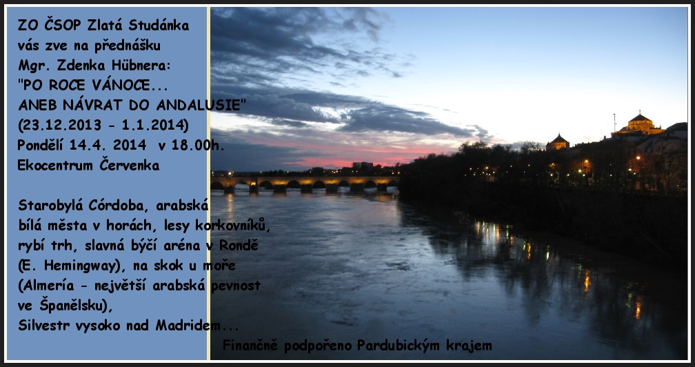 Mgr. Zdeněk Hübner přednáší: "PO ROCE VÁNOCE... ANEB NÁVRAT DO ANDALUSIE" (23.12.2013 - 1.1.2014): Starobylá Córdoba (největší mešita v Evropě), arabská bílá města v horách, lesy korkovníků, rybí trh, slavná býčí aréna v Rondě (E. Hemingway), na skok u moře (Almería - největší arabská pevnost ve Španělsku), Silvestr vysoko nad Madridem...