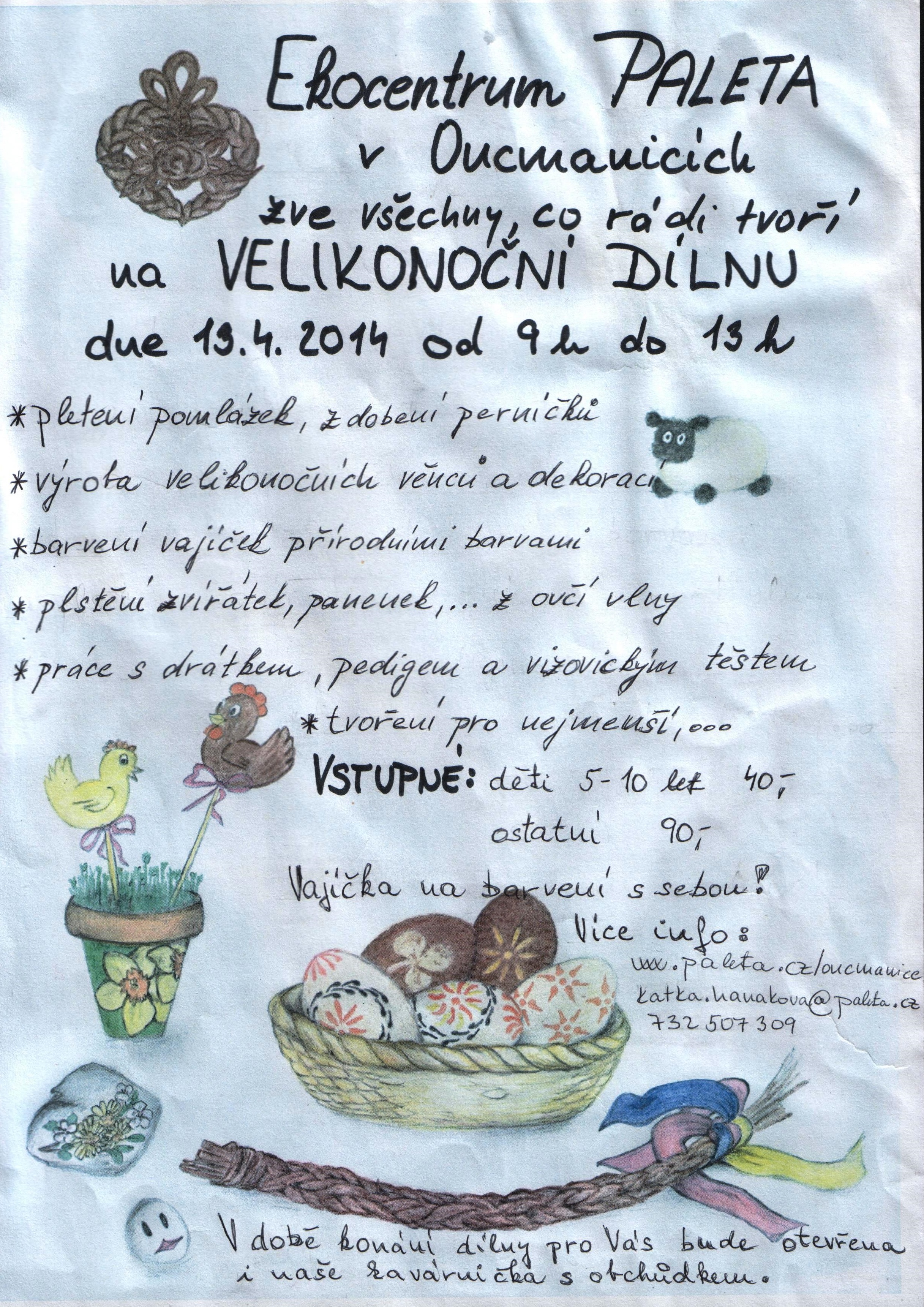 Tvořivá dílna s Hanou Fialovou: Začátky floristiky - účastník si vytvoří aranžmá z živých květů a zeleně. Osvojí si začátky floristiky v dekoraci ze živých květů. Účastník si přinese ostrý nůž a zahradnické nůžky. Lektor zajistí ostatní materiál. Počet účastníků 15-20. Cena 200Kč. Přihlášky na akci na tel. 723074475 (H. Fialová) do 8.4.2014.