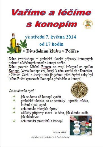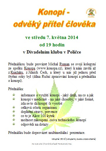 Přednáška o konopí a jeho využití v praxi, pro zdraví člověka. Více informací v příloze. Srdečně zveme.