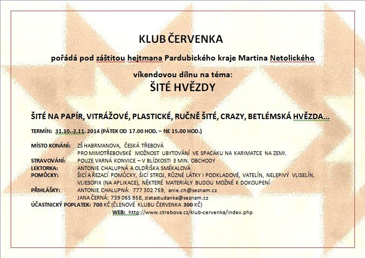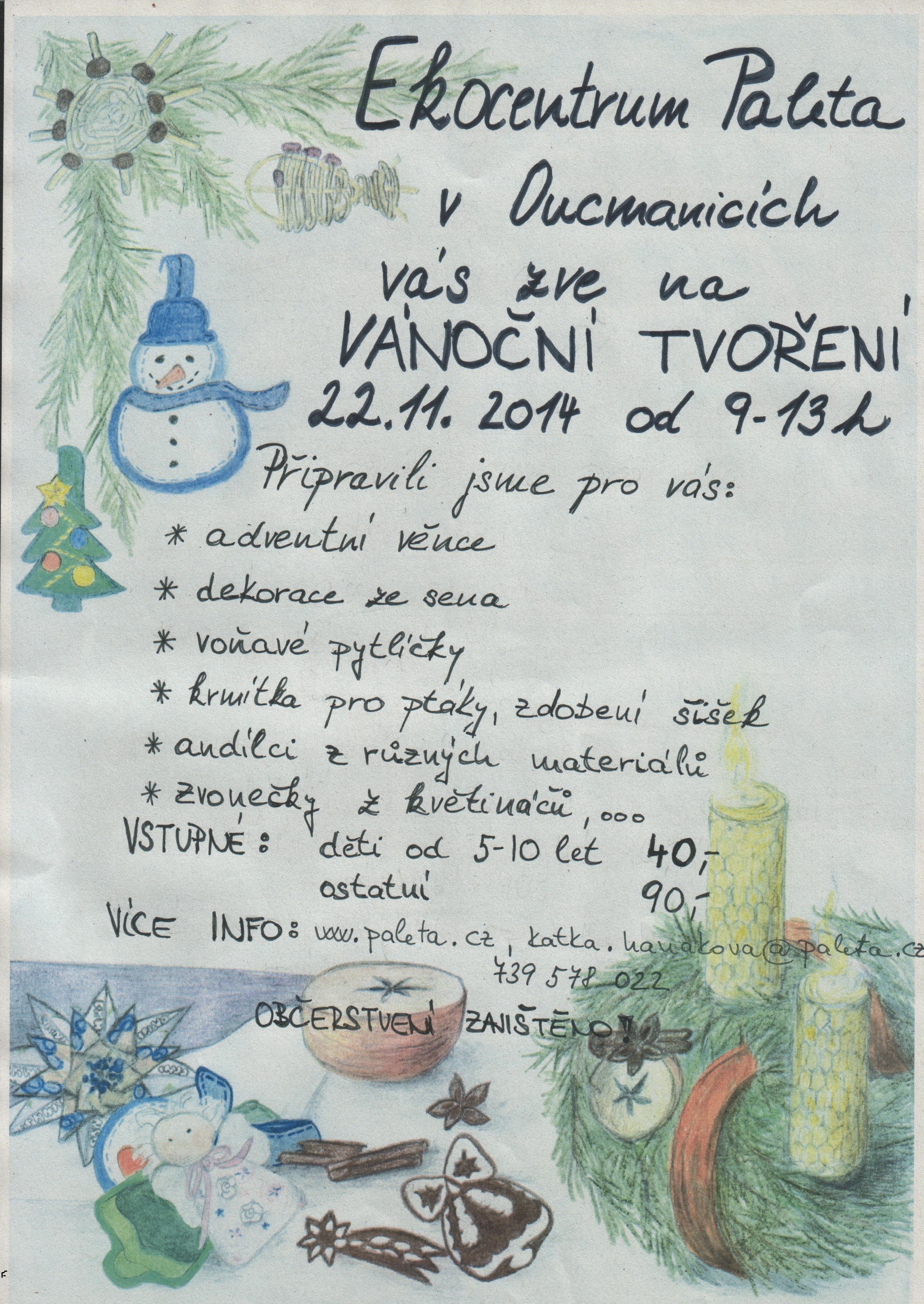 Účastník si vytvoří adventní věnec na stůl a dveře. Účastník si přinese: kleště na drát, zahradnické nůžky, pracovní nůž. Lektor zajistí ostatní materiál. Počet účastníků: 20. Cena cca 150-250,-Kč podle vybraného materiálu. Přihlášky na akci - Hana Fialová tel: 723 074 475, fialova.hana77@seznam.cz , do naplnění kapacity, max. do 17.11.2014.
