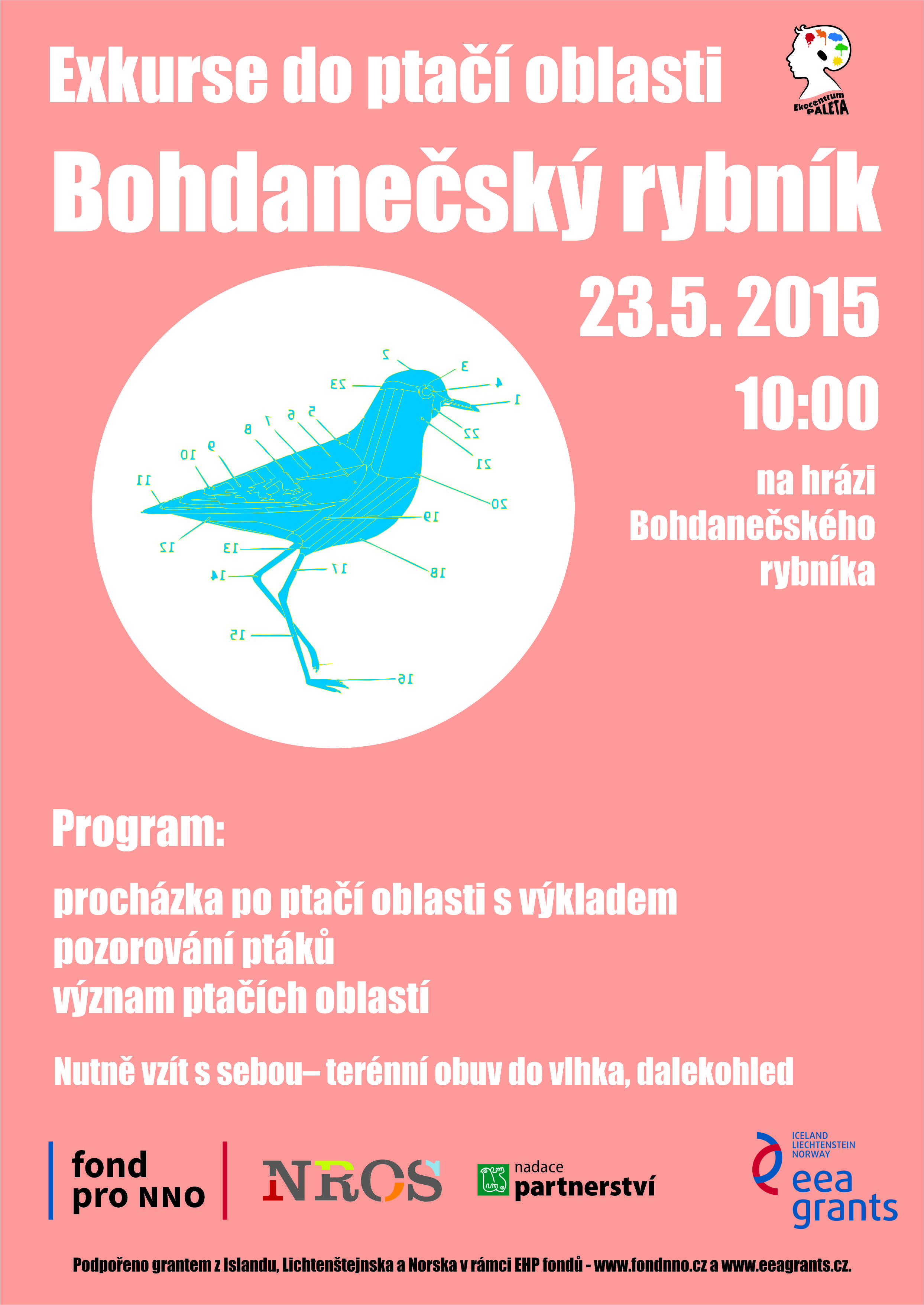 V sobotu 23. května mají nejen obyvatelé Bohdanče možnost zúčastnit se exkurze do Ptačí oblasti Bohdanečský rybník. Exkurzi, která proběhne za doprovodu odborníků v oblasti ornitologie, pořádá pardubické Ekocentrum PALETA. Sraz zájemců o účast bude v 10:00 na hrázi Bohdanečského rybníka a celá akce bude trvat zhruba do 12:00. Každý účastník by měl myslet na pevnou, nejlépe terénní obuv do vlhka a potřeba bude také dalekohled. Akce naopak není vhodná pro kočárky a psy. Další informace týkající se exkurze (včetně přesného místa srazu) je možné nalézt na webu www.paleta.cz nebo na facebooku Ekocentra PALETA.