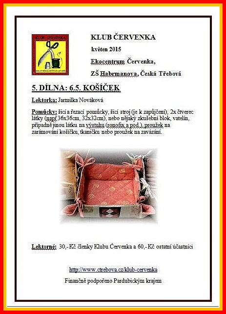 6.5. KOŠÍČEK Lektorka: Jarmilka Nováková Pomůcky: šicí a řezací pomůcky, šicí stroj (je k zapůjčení), 2x čtverec látky (např 36x36cm, 32x32cm), nebo nějaký zkušební blok, vatelín, případně jinou látku na výstuhu (ronofix a pod.), proužek na zarámování košíčku, tkaničku nebo proužek na zavázání