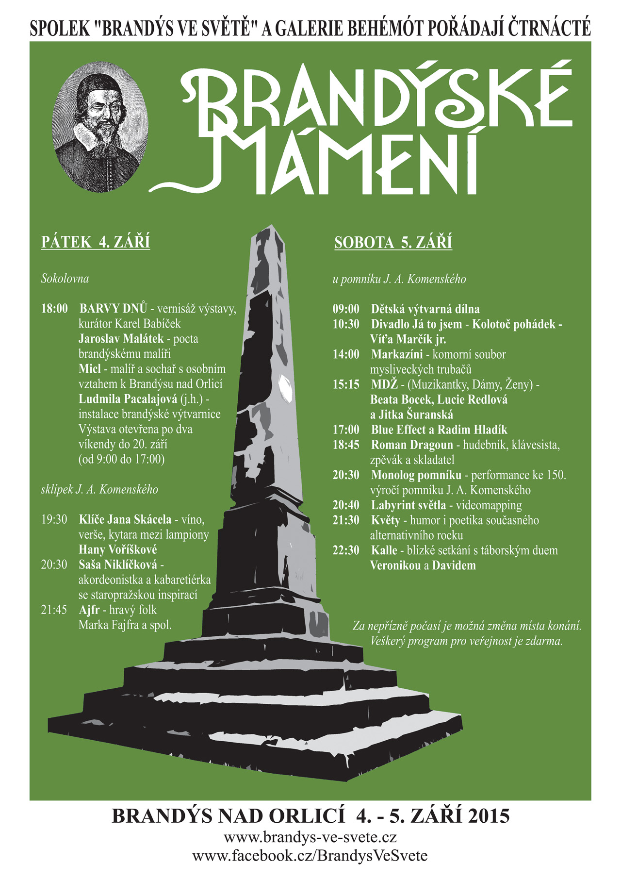 Multižánrový festival, ve kterém se koncerty a speciální performance snoubí s divadlem, vernisáží výstavy či dětskou výtvarnou dílnou. Letos ve větší míře přímo v údolí J. A. Komenského, v bezprostřední blízkosti unikátního habrového Labyrintu (světa…), pomníku J. A. Komenského a sklípku. https://www.facebook.com/events/1468533250135369/ www.facebook.com/BrandysVeSvete www.brandys-ve-svete.cz