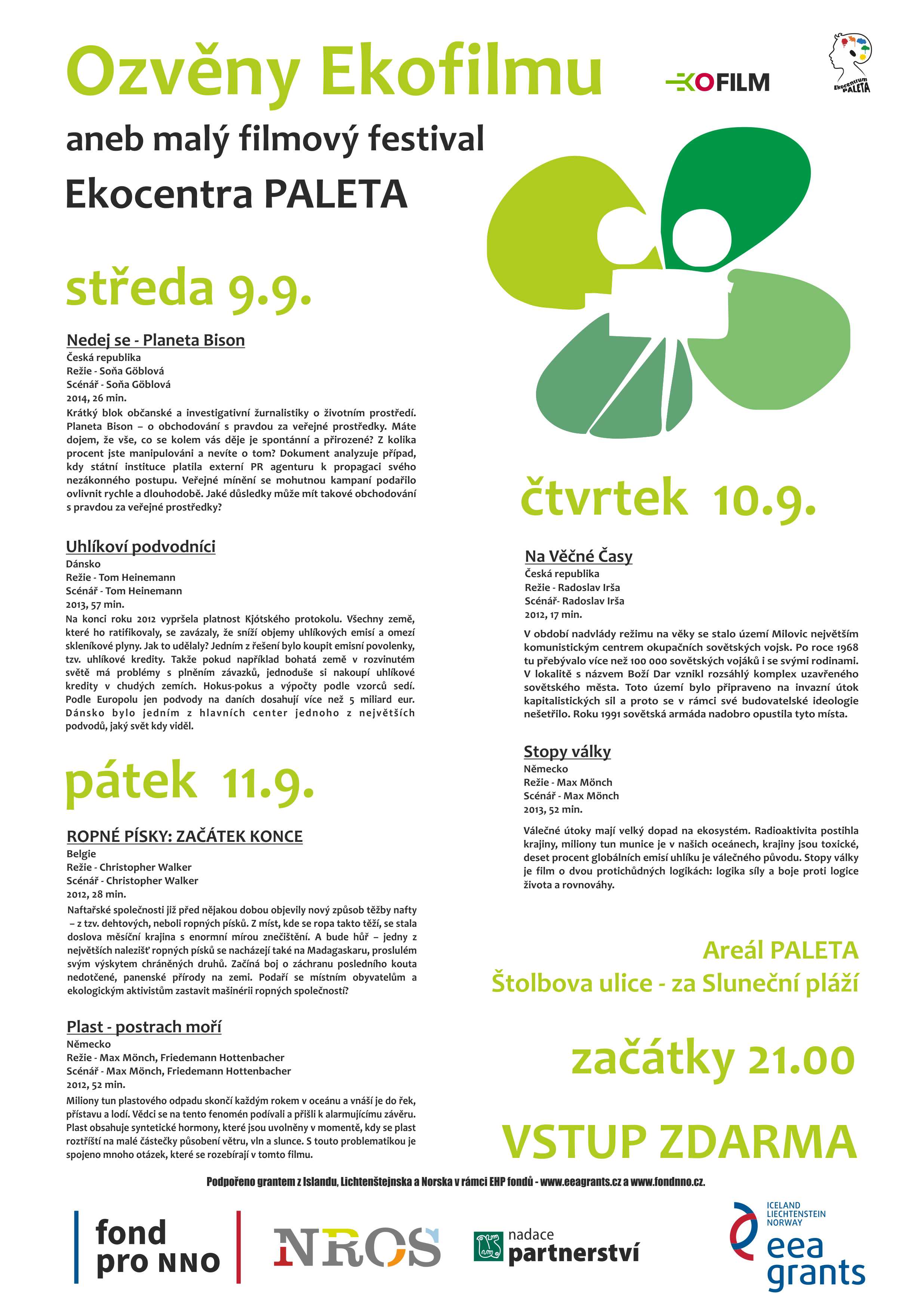 Ekocentrum PALETA zve na další pokračování filmového festivalu Ozvěny Ekofilmu. Začátek vždy ve 21:00, zdarma Pokud počasí dovolí, promítáme venku. V opačném případě je k dispozici budova čajovny. Program festivalu: 9.9. - Nedej se – Planeta Bison, ČR, Soňa Göblová - Uhlíkoví podvodníci, Dánsko, Tom Heinemann 10.9.- Na Věčné Časy, ČRRadoslav Irša - Stop války, Německo, Max Mönch 11.9.- Ropné písky – začátek konce, Belgie, Christopher Walker - Plast – postrach moří, Německo, Max Mönch a Friedemann Hottenbacher více na www.paleta.cz