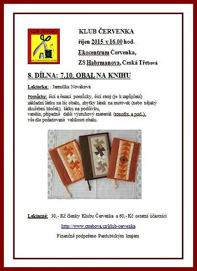 Lektorka: : Jarmilka Nováková Pomůcky: šicí a řezací pomůcky, šicí stroj (je k zapůjčení) základní látku na líc obalu, zbytky látek na motivek (nebo nějaký zkušební bloček), látku na podšívku, vatelín, případně další výztuhový materiál (ronofix a pod.), vše dle požadované velikosti obalu. Lektorné: 30,- Kč členky Klubu Červenka a 60,- Kč ostatní účastníci http://www.ctrebova.cz/klub-cervenka Finančně podpořeno Pardubickým krajem