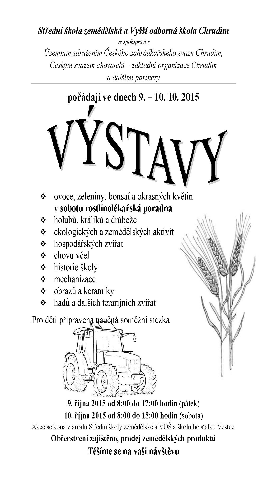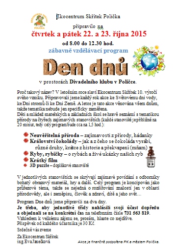 Zelený dům Chrudim, z.s. zde představí aktivity ze životního stylu a zdraví, životního prostředí a kampaň Česko proti chudobě v rámci Dnů chudoby 2015. Budou zde informace také z platformy k palmě olejné. Součástí budou i fotografie ze z.s. Educon o Zambii, Angole, Malawi a Thajsku. Kdy: Pátek 9. října od 8 do 17 hodin Sobota 10. října od 8 do 15 hodin Kde: Zemědělská škola Chrudim, Poděbradova 842. Více informací: z.s. Zelený dům Chrudim, tel: 469 811 145 (Ing.Tibor Schwarz, DiS), www.zelenydum.estranky.cz nebo na www.szes.chrudim.cz / 469 620 363 / crzemsk@szes.chrudim.cz