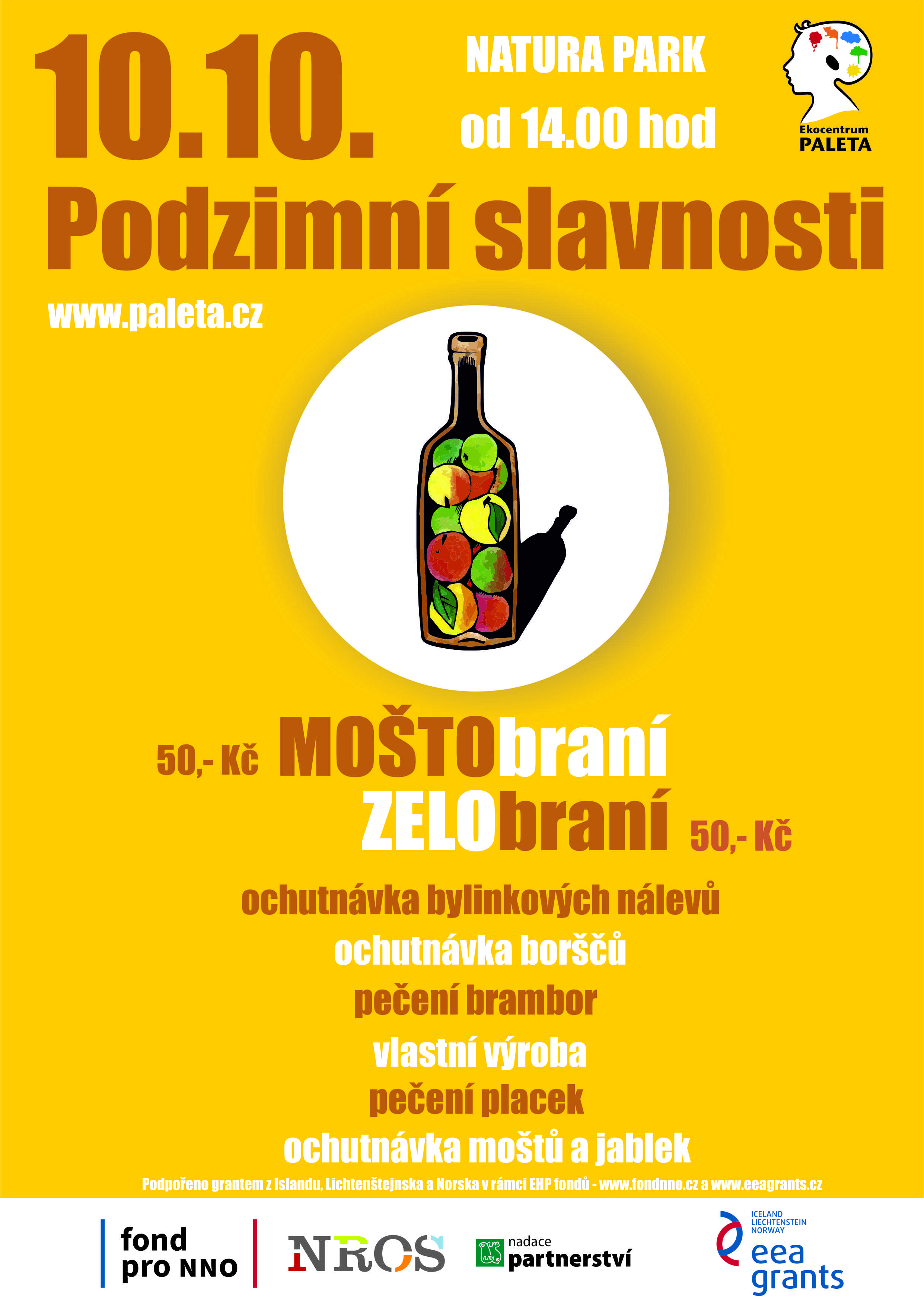 Ekocentrum PALETA pořádá tradiční zelobraní v rámci Podzimních slavností. Začínáme ve 14:00 v areálu Natura parku ve Štolbově ulici. Součástí bude tentokrát také moštobraní. Za 50 Kč od nás obdržíte sklenici a vše potřebné k jejímu naplnění. Sklenici si samozřejmě odnesete domů. Kromě zmíněného se bude také ochutnávat boršč a bylinkové nálevy, budou se péct brambory a placky. Zkrátka vše, co k podzimu patří.