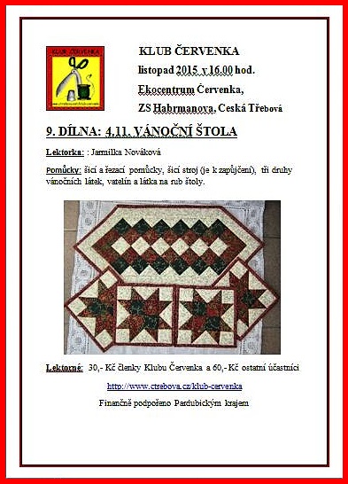 lektorka: Jarmilka Nováková Pomůcky: šicí a řezací pomůcky, šicí stroj (je k zapůjčení), 3 druhy vánočních látek,vatelin, látka na rub štoly