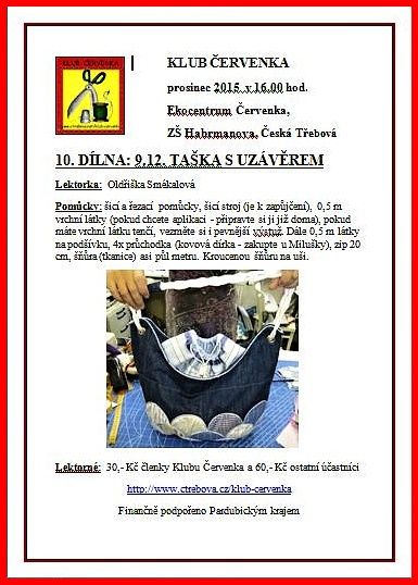 lektorka: Oldřiška Smékalová Pomůcky: šicí a řezací pomůcky, šicí stroj (je k zapůjčení), 0,5 m vrchní látky (pokud chcete aplikaci - připravte si ji již doma), pokud máte vrchní látku tenčí, vezměte si i pevnější výstuž. Dále 0,5 m látky na podšívku, 4x průchodka (kovová dírka - zakupte u Milušky), zip 20 cm, šňůra (tkanice) asi půl metru. Kroucenou šňůru na uši.