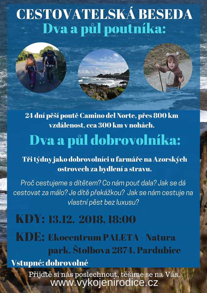 Rodina na cestách, co poznává svět. Vyprávění o cestování ve třech, na vlastní pěst, s batohy, foťákem a touhou po poznání obyčejného života místních. Přijďte si poslechnout jejich povídání o třech měsících ve Španělsku a Portugalsku!