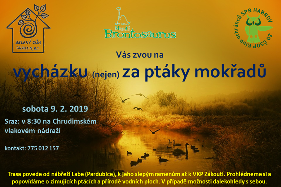 Sraz je u sochy Jana Pernera v Pardubicích v sobotu 9.února v 9:00 hod. a nebo v 8:30 hod na nádraží ČD v Chrudimi, odkud se pojede do Pardubic. S sebou teplé oblečení, dalekohled, případně svačinu a pití, případně klíč, budeme pozorovat a také určovat ptactvo. Kontakt: 775 012 157. Email: zelenydumchrudim@email.cz akce se koná v rámci světového dne mokřadů.