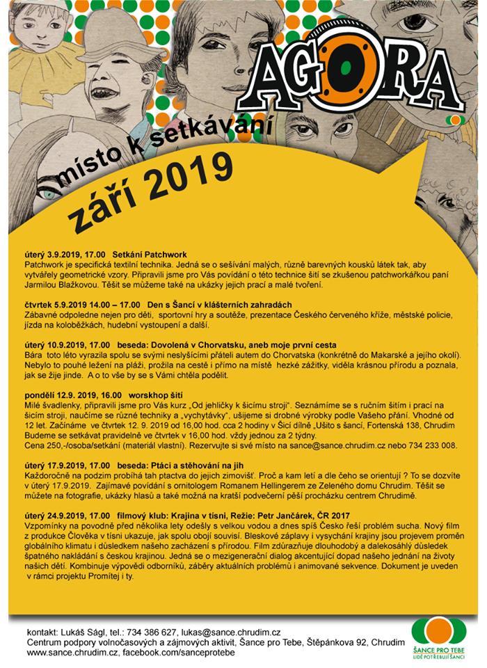 PTÁCI A STĚHOVÁNÍ NA JIH Zajímavé povídání s ornitologem Romanem Hellingerem z ČSO a Zeleného domu Chrudim od 17 hod.. Fotografie, ukázky hlasů ptactva a kratší podvečerní procházka centrem Chrudimě (začátek v 18 h, sraz před klubem). Dotazy pro vycházku a besedu na tel: 602 740 053. Úterý 17. září v 17 hodin beseda, vycházka od 18 hod. Klubu Agora – Šance pro Tebe, Štěpánkova 92, Chrudim. Akce se koná v rámci Dnů chudoby, Evropského týdne mobility a Týdnů pro duševní zdraví. Podpořeno Městem Chrudim a Pardubickým krajem. Vstup zdarma.