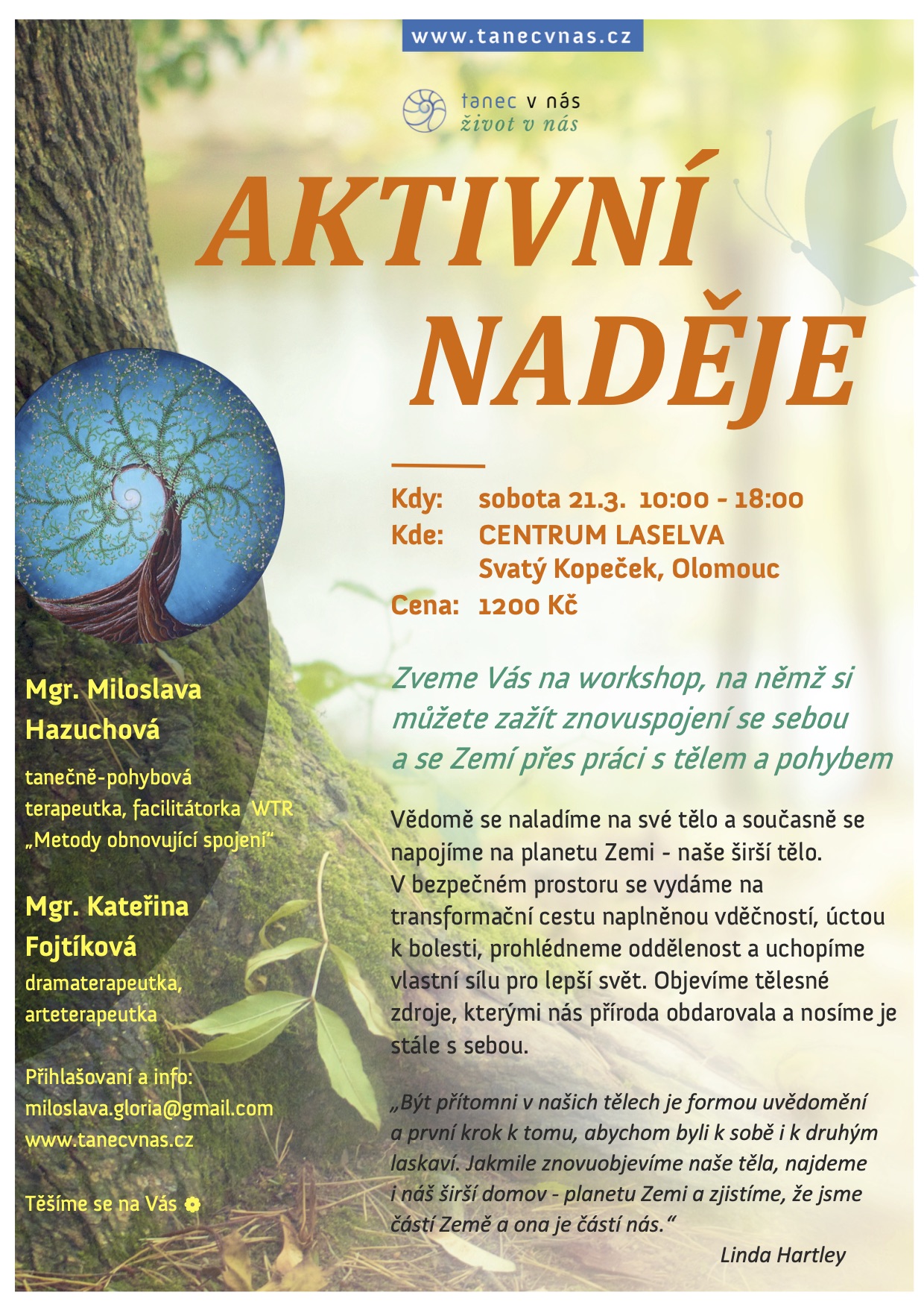 Srdečne zveme na zážitkový workshop na jarní rovnodennost! :) Obsahem semináře je filozofie hluboké ekologie podle Metody WTR od Joanny Macy - doplněná o práci s tělem a prvky arteterapie.