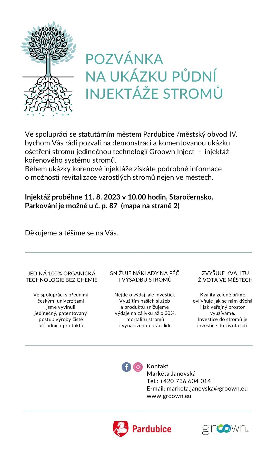 Ve spolupráci se statutárním městem Pardubice bychom Vás rádi pozvali na demonstraci a komentovanou ukázku ošetření stromů jedinečnou technologií Groown Inject - injektáž kořenového systému stromů. Během ukázky získáte podrobné informace o možnosti revitalizace vzrostlých stromů nejen ve městech. Na akci je nutno se předem přihlásit na uvedeném kontaktu.