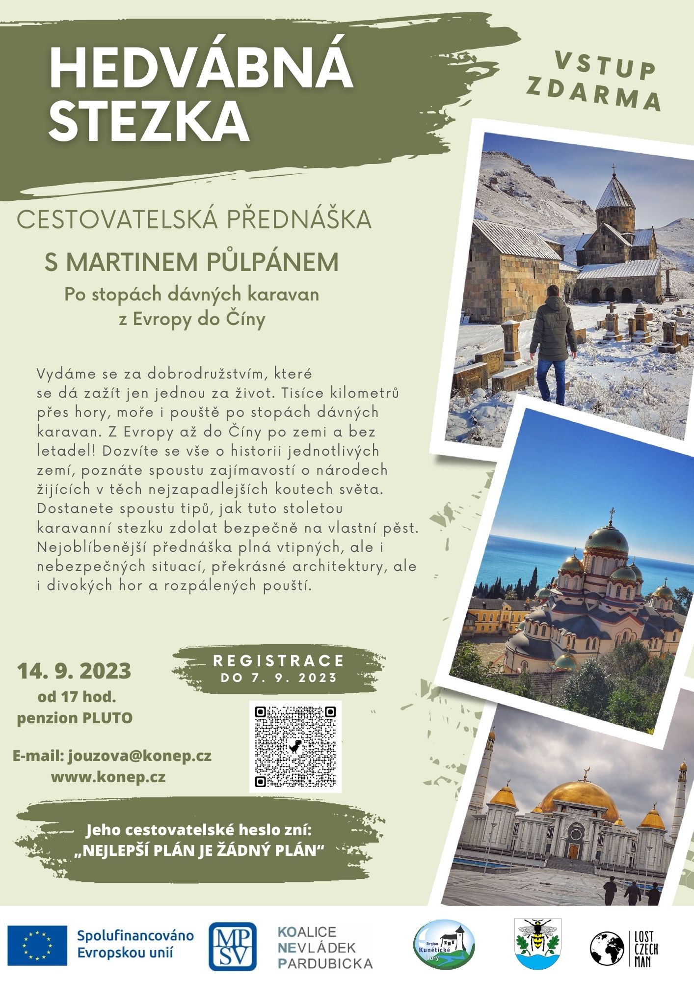 Vydejte se s Martinem Půlpánem po stopách dávných karavan z Evropy do Číny, kterou absolvoval po pozemní cestě. Vydáme se za dobrodružstvím, které se dá zažít jen jednou za život. Tisíce kilometrů přes hory, moře i pouště z Evropy až do Číny. Dozvíte se vše o historii jednotlivých zemí, poznáte spoustu zajímavostí o národech žijících v těch nejzapadlejších koutech světa a mnoho dalšího. KDY a KDE? –> 14. 9. 2023 od 17 hodin v penzionu Pluto VSTUP ZDARMA - Tato přednáška je realizována v rámci projektu Komunita pro komunitu, který je spolufinancován EU. Je především pro občany žijící v obcích spadajících do MAS Region Kunětické hory . Kapacita omezena. Nutná registrace! Přihlásit se můžete zde --> https://docs.google.com/.../1exa-Y8sPpUGLl.../edit