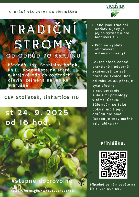 Pro všechny milovníky jablek, zahradničení a biodiverzity přinášíme přednášku s panem Bočkem. Uvidíme se u nás ve Stolístku ve středu 24.9. Přihlašujte se prosím na: https://forms.gle/KWK5uEuCdxeo5VSb7 nebo telefoním čísle 734 504 660