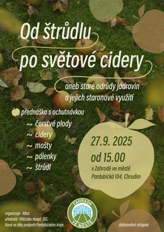 Od štrůdlu po světové cidery aneb staré odrůdy jádrovin a jejich staronové využití. Podoba, vůně a chuť - na to vše se budou moci těšit účastníci přednášky věnované starým a krajovým odrůdám ovocných stromů. Kromě možnosti vidět plody desítek starých a krajových odrůd jádrovin, je budou moci i ochutnat. Ovšem nejenom plody, ale také výrobky z nich. Ochutnávka bude věnována zejména moštům, nejvíce pak ciderům a okrajově také pálenkám, ale nebude chybět ani štrůdl ! Přednáší Vítězslav Haupt v komunitní zahradě Zahrada ve městě (Pardubická 104), od 15 hodin. Zdarma. Koná se díky podpoře Pardubického kraje.