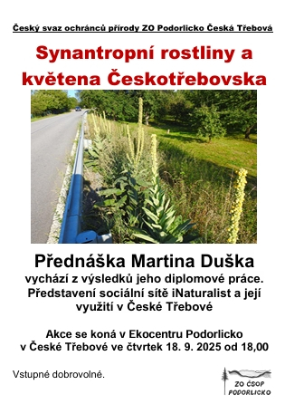 Přednáška Martina Duška vychází z výsledků jeho diplomové práce. Představení sociální sítě iNaturalist a její využití v České Třebové Akce se koná v Ekocentru Podorlicko v České Třebové ve čtvrtek 18. 9. 2025 od 18,00 Vstupné dobrovolné.